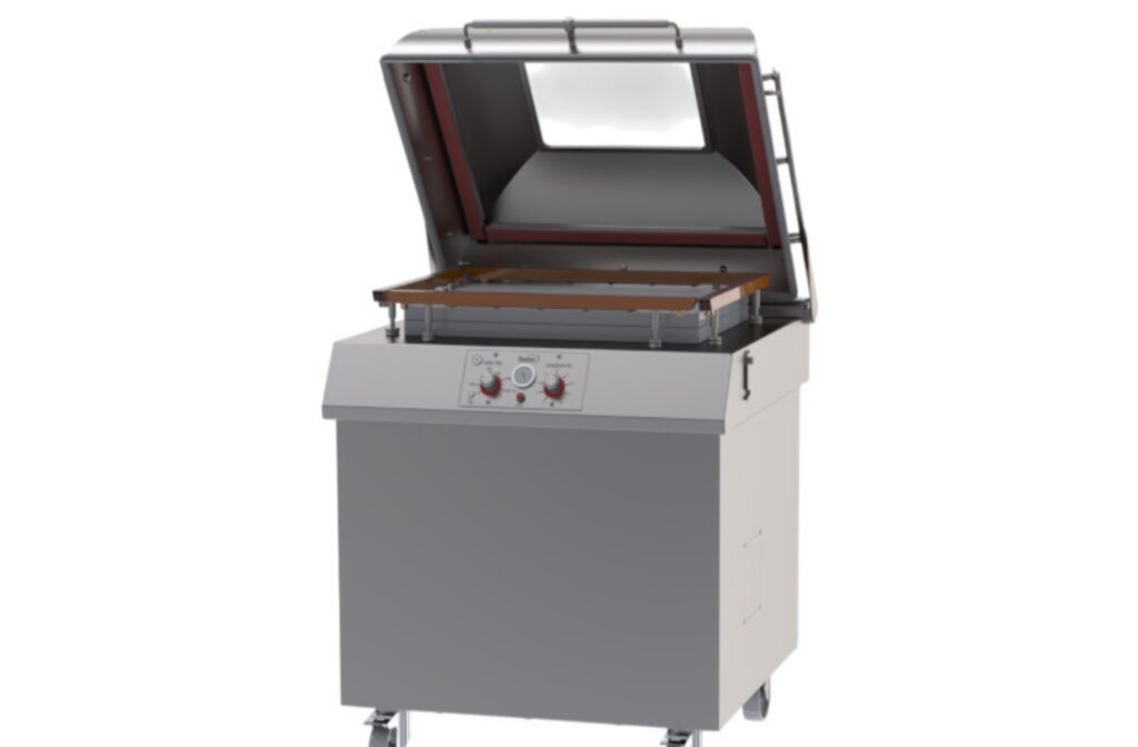 Machine de table performante, équipée d’une pompe Becker garantie trois ans, double soudure, cloche inox robuste et surface plane facile à nettoyer.